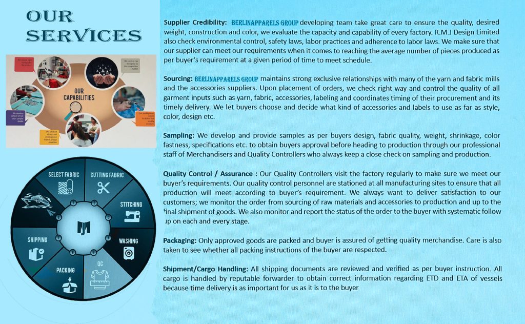 At Berlin Apparels, we take immense pride in our commitment to excellence in every aspect of our business. With manufacturing facilities in Bangladesh and an office in Germany, we stand at the forefront of the apparel industry, specializing in high-quality knits, wovens, and sweaters. Our team has built a reputation for delivering products that meet the highest standards, with efficiency and reliability at the core of our operations.